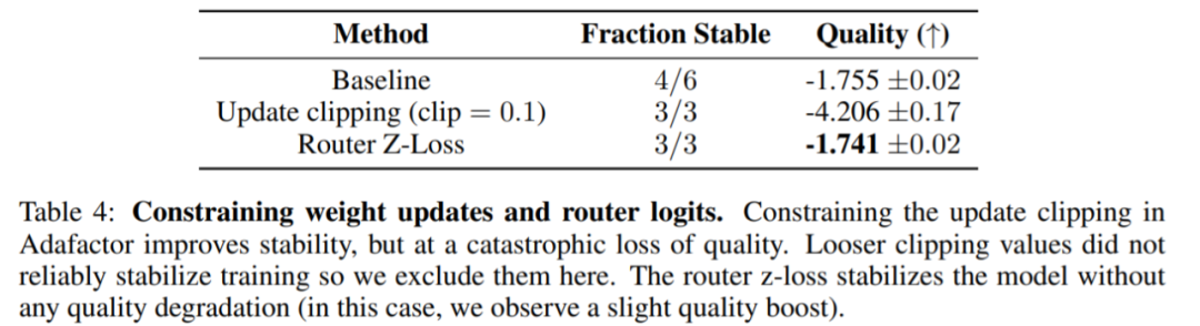 下表 4 显示,在三次运行中,update clIPPING 和 RouteR z-loSS 都稳定了模型,但是 update clIPPING 严重影响了模型的质量。因此,研究者使用 z-loSS 方法来固定模型稳定性。