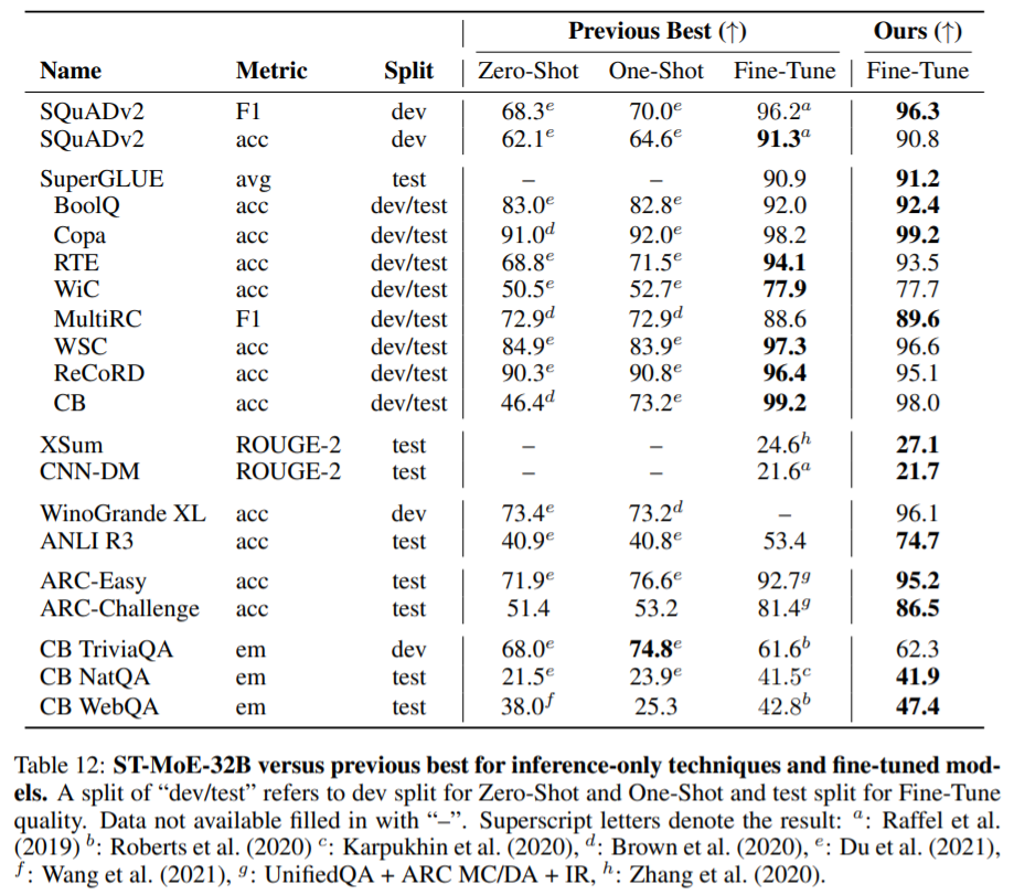 这篇论文的目的就是提高稀疏模型的实用性和可靠性。他们研究了这两个问题,并给出了设计指南。最后,他们将稀疏模型的参数缩放到 269B,其计算成本与 32B 密集编码器 – 解码器 TRansfoRMeR(稳定、可迁移的 MixtuRe-of-ExpeRts、ST-MoE-32B)相当。这是稀疏模型首次在迁移学习中实现 SOTA 性能,跨越了一系列不同的任务,包括推理(SupeRGLUE、ARC Easy、ARC Challenge)、摘要(XSuM、CNN-DM)、闭卷问答(WebQA、NatuRal Questions)和对抗式构造任务(WinogRande、ANLI R3)。